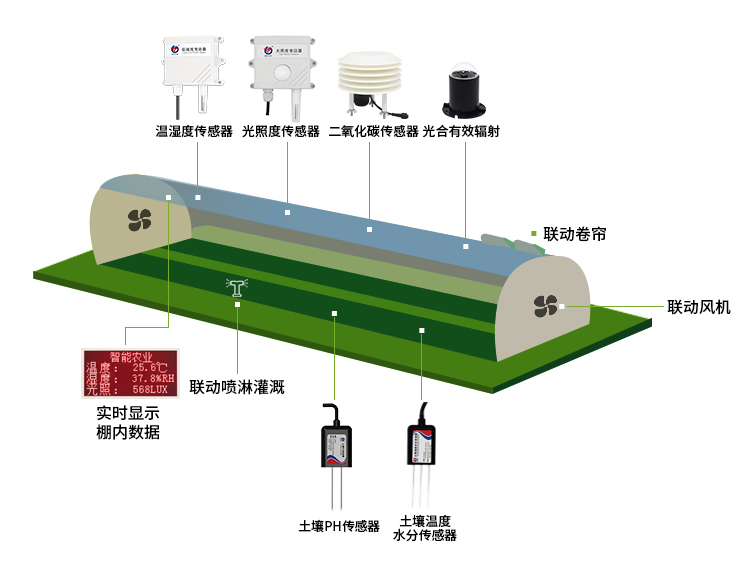 建大仁科溫室大棚環境監測系統,利用物聯網技術精準培育果蔬以及實現溫室內各種作物的生產過程控制,采用溫室內無線溫濕度傳感器、光照度傳感器、二氧化碳傳感器、百葉盒、土壤溫濕度傳感器等硬件設備,對農作物生產進行實時動態監測,從而產生動態實時現場數據,同時監測生產環境中公眾環境參數的數據,將硬件設備收集到的各種數據傳輸到建大仁科環境監測云平臺或者是企業相應的云平臺中,實現對作物生產過程中進行自動控制,保證溫室內弄作為的生長具有相應的良好適宜環境。