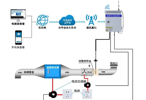 建大仁科油煙監測系統由油煙在線監測儀、數據傳輸技術和環境監測云平臺組成,該系統可對油煙濃度、顆粒物濃度、非甲烷總烴濃度,以及風機、凈化器的運行狀態進行實時監測,集油煙監測、數據采集、數據傳輸等功能為一體,將數據上傳到監控平臺,實現監管人員和餐飲企業管理的遠程查看。