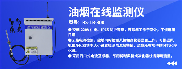RS-LB-300 是我司響應國家對餐飲行業油煙進行監管,所設計的一款油煙在線監測主機。主機能夠對餐廚排煙管道的油煙濃度、顆粒物濃度、非甲烷總烴(NMHC)濃度進行 24小時不間斷測量,并上傳我司免費云平臺或政府監控平臺。